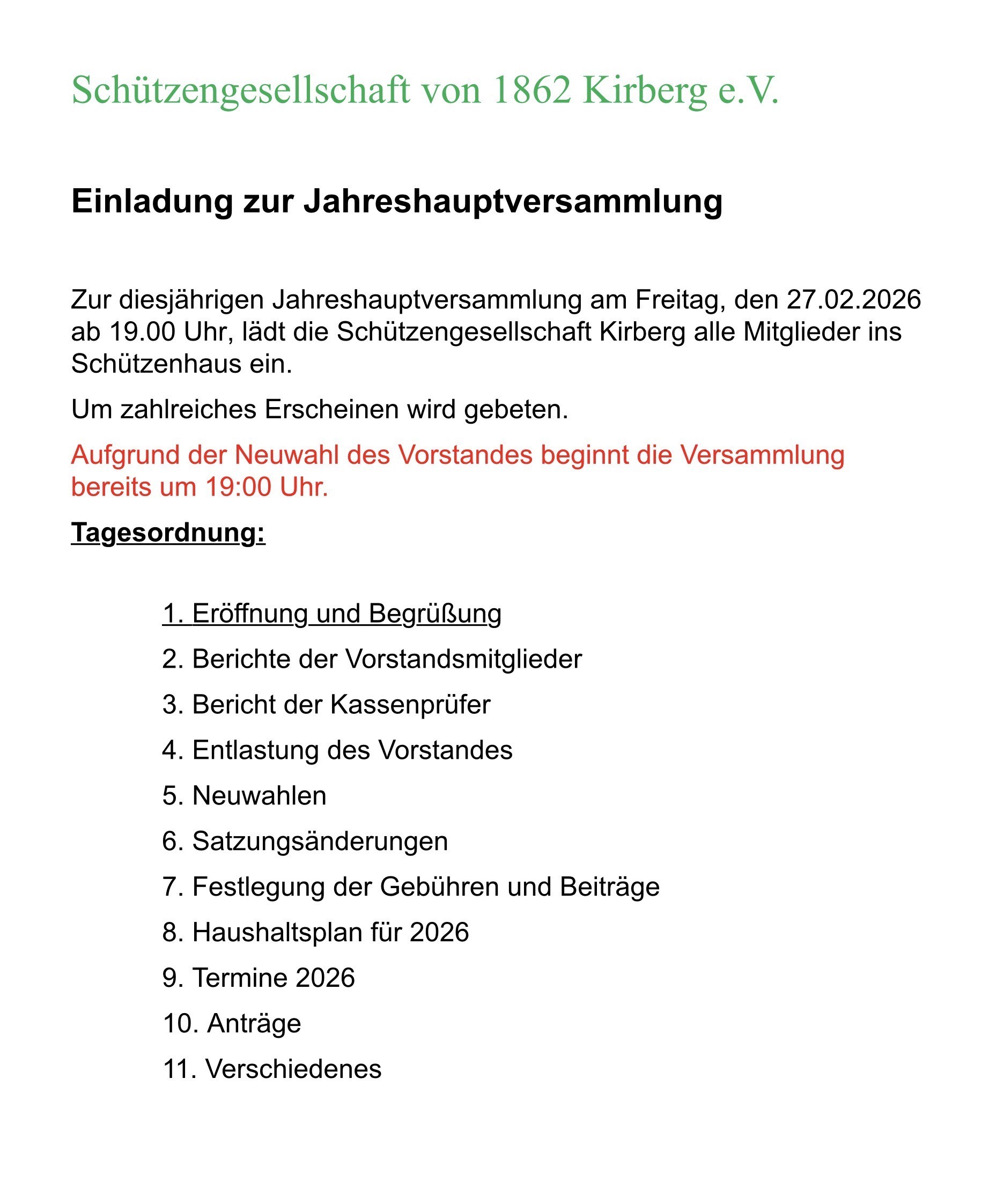 Zur diesjährigen Jahreshauptversammlung am Freitag, den 14.03.2025 ab 20.00 Uhr, lädt die Schützengesellschaft Kirberg alle Mitglieder ins Schützenhaus ein.